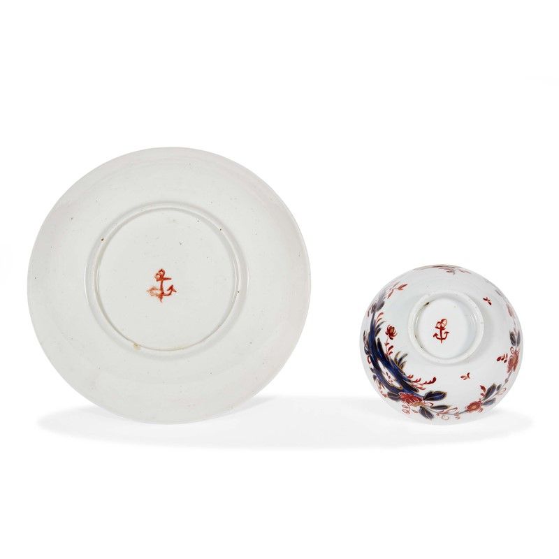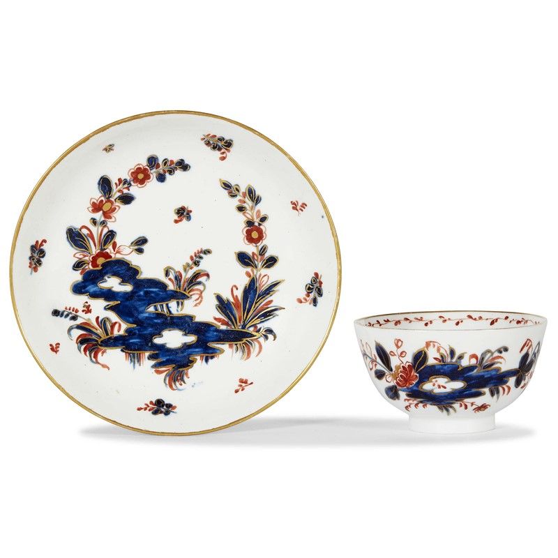 in porcellana dipinta in policromia e oro, decorata in stile Imari con paesaggio centrato da una roccia Tahiu e composizioni floreali sparse. All’interno della tazzina è dipinta una piccola composizione floreale. Tazza a coppetta su base ad anello. Marca in rosso sul fondo di entrambe i pezzi; tazzina alt. cm 4,2, piattino diam. cm 11,5