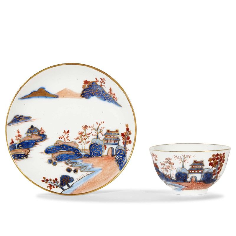 in porcellana dipinta in policromia e oro, decorata in stile Imari con paesaggi, architetture e colline stilizzate. All’interno della tazzina è dipinto un piccolo paesaggio con pagoda. Tazza a coppetta su base ad anello. Marca in rosso sul fondo del piattino; tazzina alt. cm 4, piattino diam. cm 11,7
