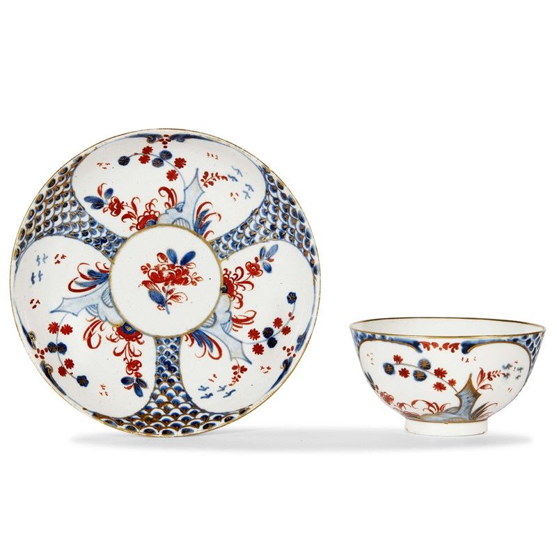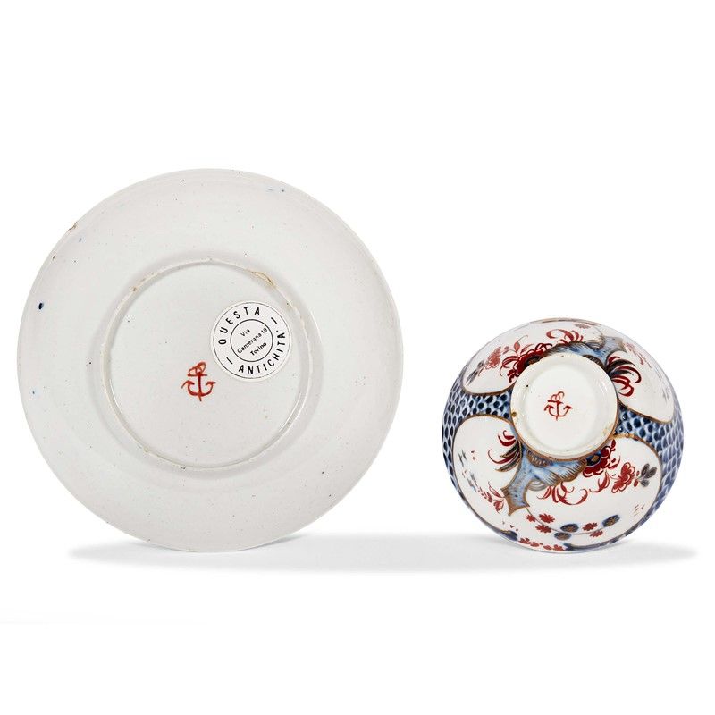 in porcellana dipinta in policromia e oro, decorata nel caratteristico motivo definito negli inventari di fabbrica come Blò oro e fiori, di chiara ispirazione orientale Imari, caratterizzato da un doppio motivo, tre riserve ellittiche con fiori stilizzati su zolle erbose intervallate da un fondo decorato a squame. All’interno della tazzina è dipinta una composizione floreale. Tazza a coppetta su base ad anello. Marca in rosso sul fondo di entrambe i pezzi; sul retro del piattino etichetta di provenienza QUESTA ANTICHITÀ – TORINO. Tazzina alt. cm 4, piattino diam. cm 11,8