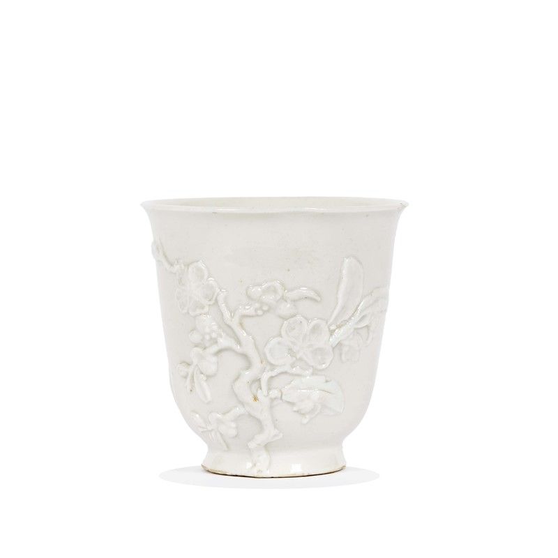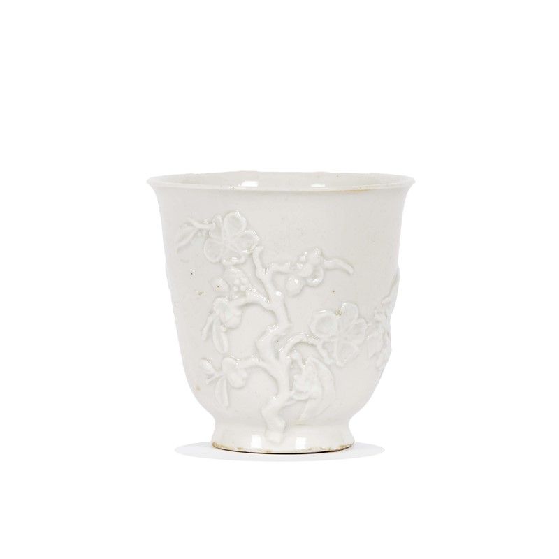 in porcellana bianca, sul corpo decoro con due rami di fiori di pruno a rilievo che nascono dalla base della tazzina. Negli inventari della manifattura questo decoro veniva definito “bianco con rilievi di fiori e foglie” o forse “con fiori a basso rilievo”. Tazzina a forma di campana su piede ad anello leggermente estroflesso; alt. cm 6,8