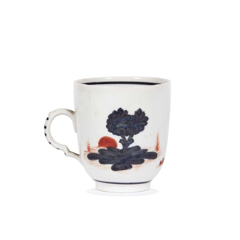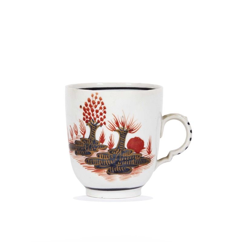 TAZZINA, DOCCIA, MANIFATTURA GINORI, 1765 CIRCA in porcellana dipinta in policromia e oro nei toni Imari, decorata su un lato da paesaggio con due alberi su ampie zolle erbose impreziosite da ampi tocchi d’oro, sull’altro da una veduta più semplice con un singolo albero e il sole all’orizzonte. Tazza a forma di campana su piede ad anello con presa ad orecchio; alt. cm 6,8