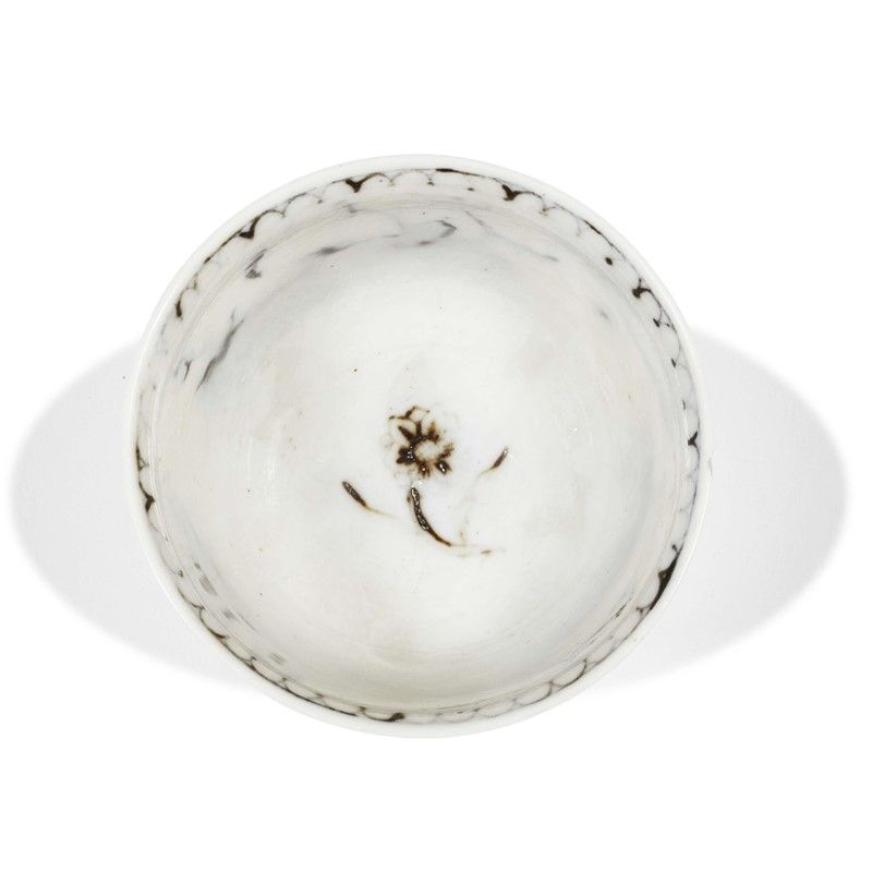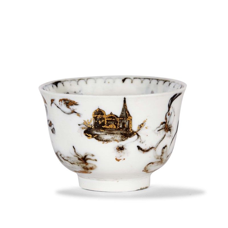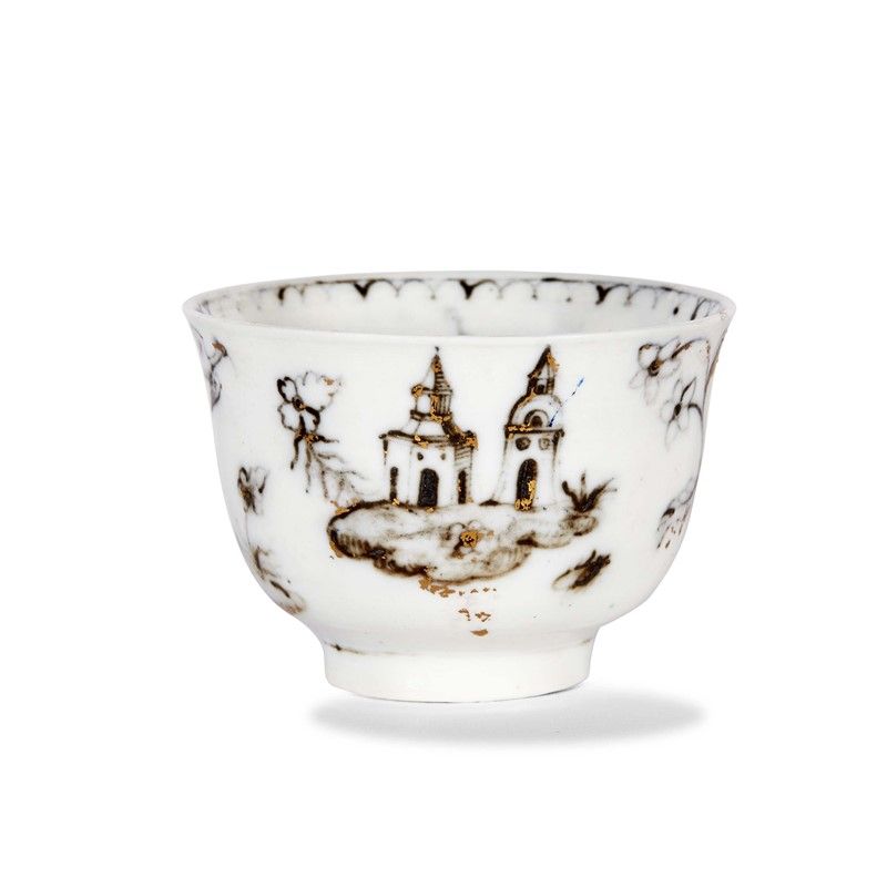 in porcellana dipinta in bruno di manganese con abbondanti lumeggiature in oro. La decorazione prevede piccoli edifici orientali disposti su terrazze legate tra loro da arbusti fioriti, tipico esempio di quei motivi “alla cinese” tanto amati in Occidente e spesso presenti nella produzione della manifattura veneziana. All’interno della tazzina un fiore su stelo fogliato. Tazza a coppetta su base ad anello. Sul fondo marca in bruno VENEZIA e numero 3 inciso nella pasta; alt. cm 5,4, diam. cm 7,7