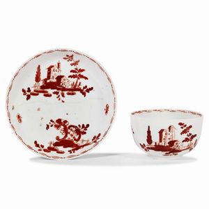 TAZZINA CON PIATTINO, NOVE, MANIFATTURA P. ANTONIBON, 1765-1780 in porcellana dipinta in monocromia rosso ferro. [..]