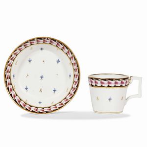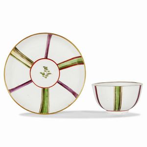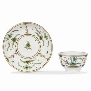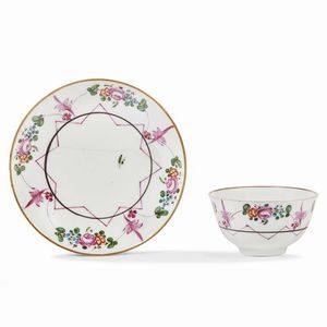 TAZZINA CON PIATTINO, NAPOLI, REAL FABBRICA FERDINANDEA, SECOLO XVIII in porcellana policroma; il decoro prevede [..]