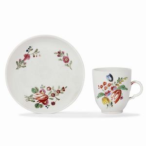 TAZZINA CON PIATTINO, DOCCIA, MANIFATTURA GINORI, 1760 CIRCA in porcellana dipinta in policromia, decorata con [..]