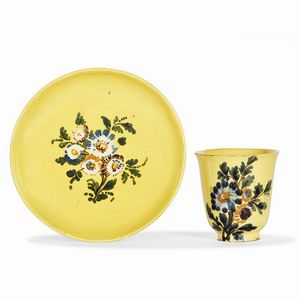 TAZZINA CON PIATTINO, DOCCIA, MANIFATTURA GINORI, SECOLO XVIII in porcellana dipinta in policromia, decorata secondo [..]