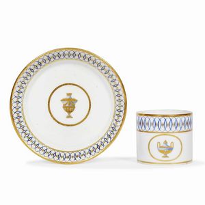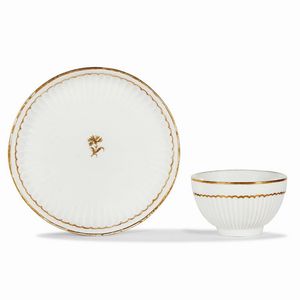 TAZZINA CON PIATTINO, DOCCIA, MANIFATTURA GINORI, FINE SECOLO XVIII in porcellana dipinta in monocromia e oro, [..]