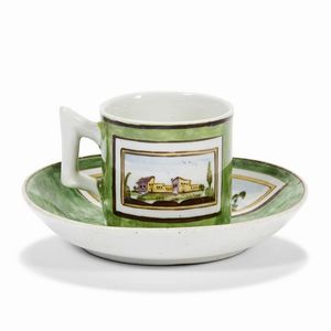 TAZZINA CON PIATTINO, NOVE, MANIFATTURA G. BARONI, 1800-1820 in porcellana dipinta in policromia. La decorazione [..]
