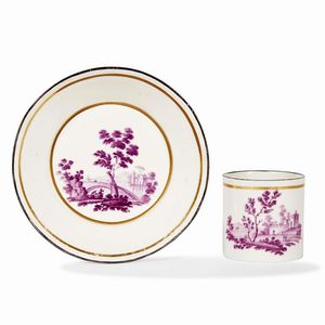 TAZZINA CON PIATTINO, DOCCIA, MANIFATTURA GINORI, FINE SECOLO XVIII in porcellana dipinta in monocromia e oro, [..]