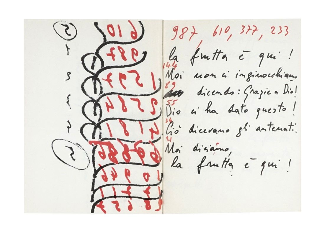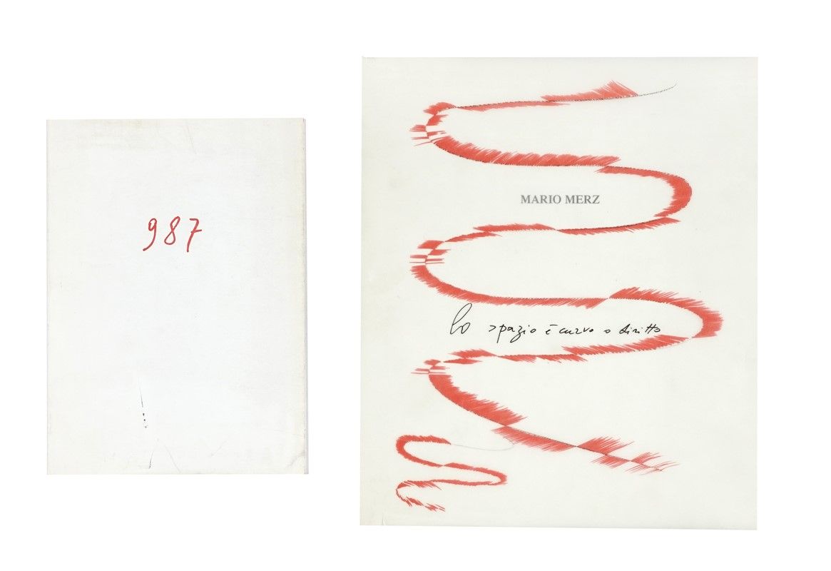 In-8° (mm 205x150). Carte [20]. Con segni, numeri, disegni e testo stampati alternativamente in rosso e nero. Brossura editoriale con titolo in rosso al piatto. Trascurabile macchia al piatto, altrimenti ottima copia. Esemplare con numerazione non apposta, su una tiratura di 987 copie. SI AGGIUNGE: Mario Merz. Firenze: Hopeful Monster, 1990.