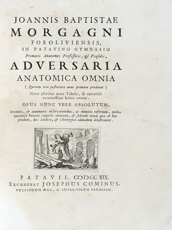 6 parti in 3 volumi in-4° (mm 275x210). Pagine XXVII, 1 bianca, [8], 53, [1] con 4 tavole fuori testo numerate I-IV; 2 bianche, [6], 103, [1] con 1 tavola fuori testo; [4], 115, 1 bianca con 1 tavola ripiegata fuori testo; [16], 91, 1 bianca con 1 tavola fuori testo; [8], 124 con 2 tavole fuori testo; [8], 137, [3] con 2 tavole fuori testo. Con, complessivamente, 11 tavole fuori testo incise in calcografia. Ciascuna parte con proprio frontespizio, i primi tre con vignetta calcografica e i successivi con fregio xilografico; marca dello stampatore incise in legno ai colophon. Assente il ritratto dell'Autore in antiporta al primo volume. Secondo volume con fioriture della carta, in generale occasionali piccoli strappi marginali e rare macchie. Legatura coeva in piena pergamena rigida con titoli in oro su tassello al dorso e tagli spruzzati. Assente il tassello del secondo volume.