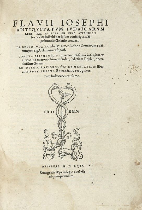 In folio (mm 325x210). Pagine [8], 886, [34]. Marca editoriale impressa in legno ripetuta in principio e fine di volume. Fori di tarlo nel testo con perdita di parte di lettere nei primi fascicoli, prime carte con mancanze in corrispondenza dell'angolo inferiore esterno, copia marginalmente gorata ma complessivamente completa e ben conservata. Legatura in piena pelle di scrofa con ampie impressioni concentriche a motivo religioso ai piatti; al piatto anteriore sigla "I.D.V." impressa a secco e ripassata a inchiostro. Fermagli metallici conservati. Spellature a piatti e dorso, alcune mancanze in corrispondenza della cuffia inferiore. Note manoscritte in principio di volume; un ex-libris di precedente collezione applicato al contropiatto anteriore. Copia parzialmente postillata.