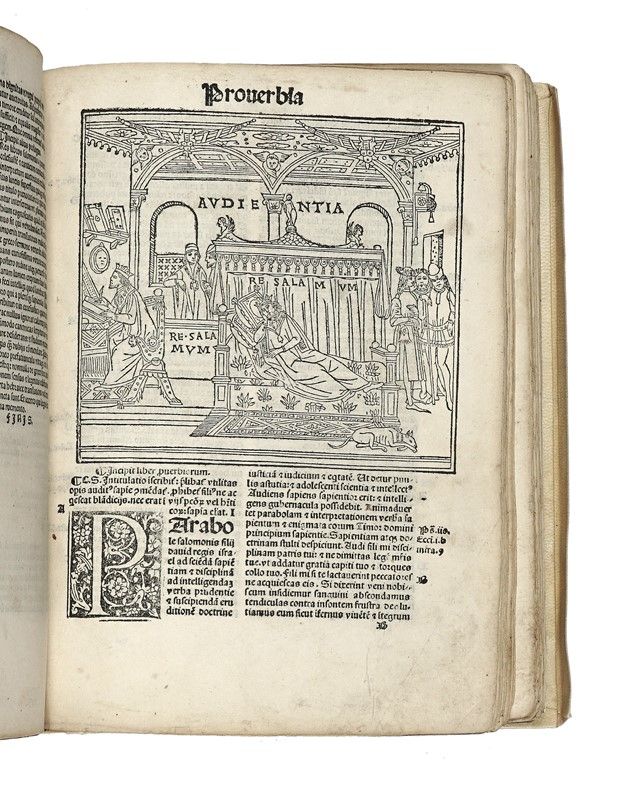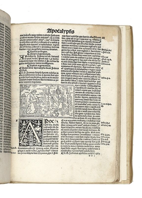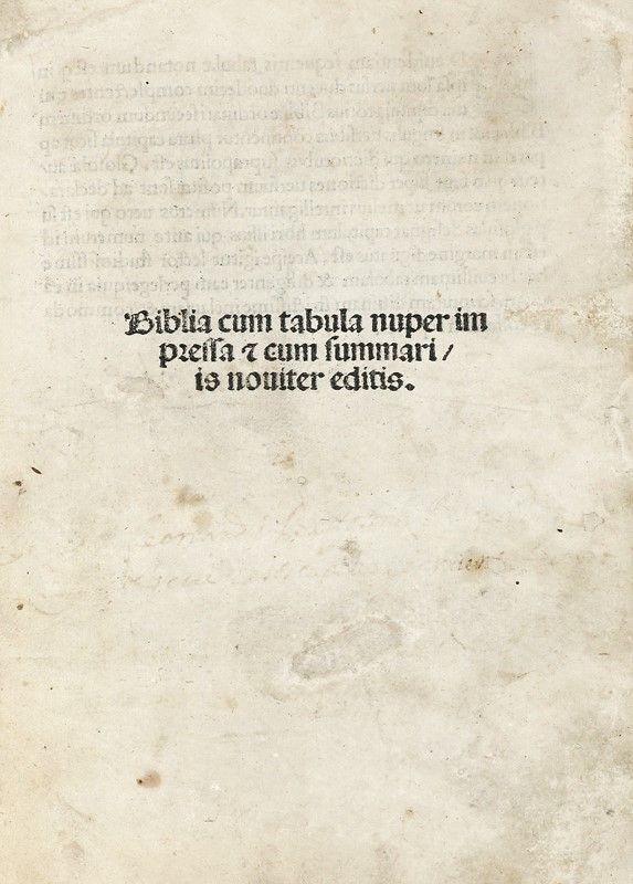 In-4° (mm 215x155). Carte [528]. Segnatura: [1]? [2]? χa¹? a-q? r? s[lunga]? s-z? &? [con]? [rum]? A-Z? 2a-2g? 2h¹? 2A-2D? 2E?. Testo su 51 linee (G 130, R 107, G 85, G 63). Iniziali e xilografie nel testo. Marca tipografica Bevilacqua in fine volume. La presente copia ha il Prologus in Bibliam (10 carte) rilegato dopo il fascicolo a (Genesis) ma presente e il fascicolo n rilegato per errore prima del fascicolo m. Tracce d'uso marginali, alcune fioriture, piccoli restauri nelle prime due carte ma copia completa e complessivamente ben conservata. Legatura moderna in piena pergamena rigida con titoli manoscritti al dorso.