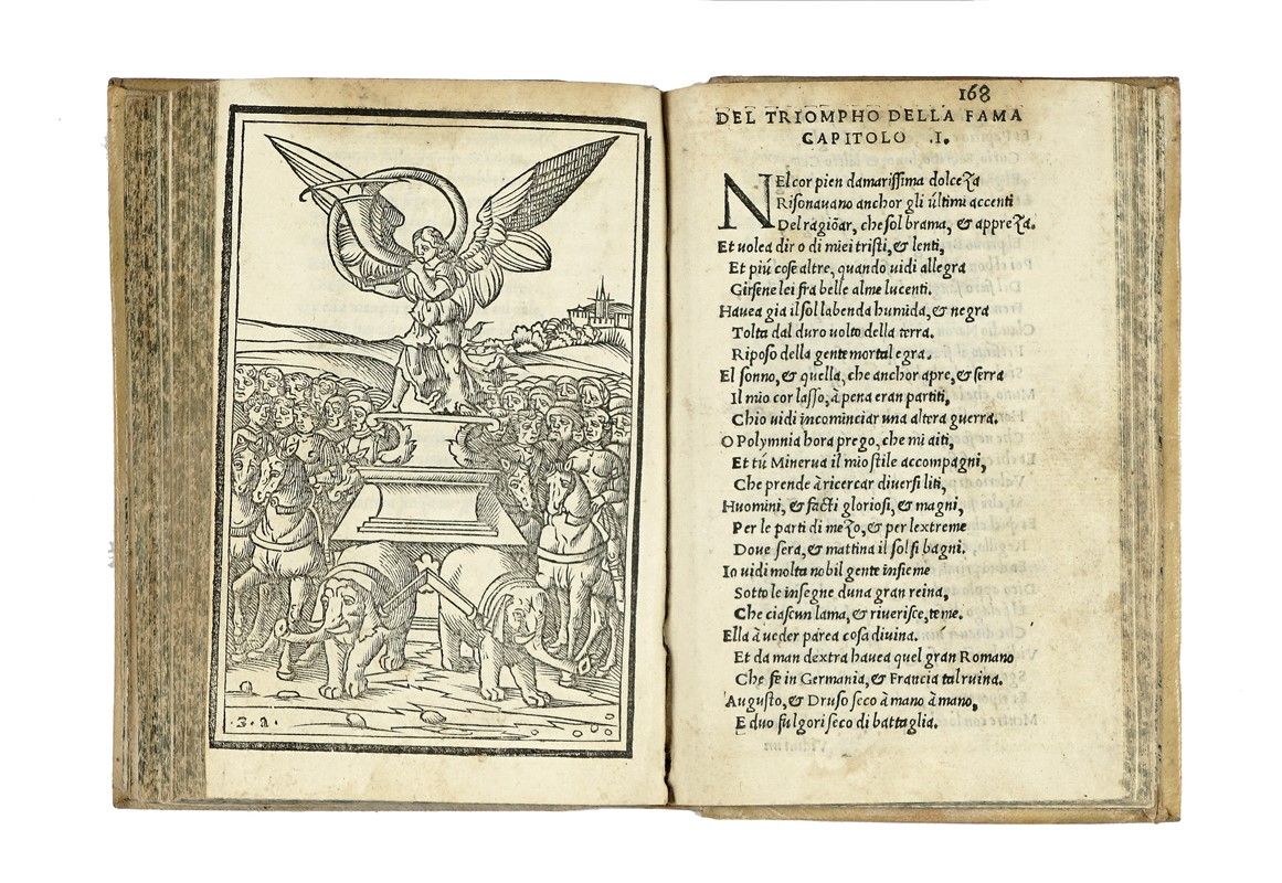 In-8° (mm 136x86). Carte 193, [7]. Frontespizio entro cornice xilografica e 6 illustrazioni a piena pagina in legno nel testo. Copia da studio, con difetti: rifilata (con perdite marginali d'inciso nel frontespizio e nelle tavole) con macchie d'inchiostro e gore a parte delle carte. Legatura settecentesca in piena pergamena rigida con titoli manoscritti al dorso. Note manoscritte in principio di volume. SI AGGIUNGE Id., Sonetti et Cancioni ... in vita di madonna Laura [1521?]. In-24° (mm 100x50). Lotto non passibile di restituzione.