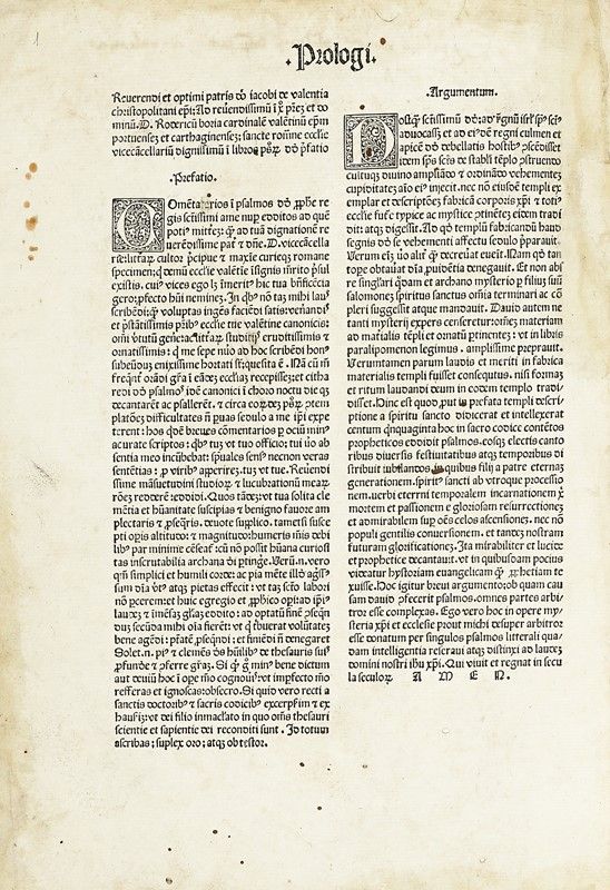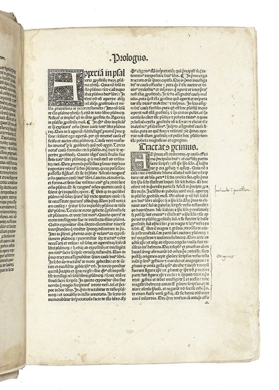 In-folio (mm 335x235). Carte [397] (di 400). Segnatura: a8, b10, c8; a-v8, x10, y-z8, aa-ii8, ll8, mm6, A-I8, L8, M10; a12 (-a10, a11-a12, bianche). Testo in carattere gotico, in doppia colonna, su 50 righe più titolo. Bei capilettera in legno in stile tipicamente spagnolo. Postille di differente mano, concentrate principalmente nella prima parte. Mancanti le carte a10-a12 (tabula). Reintegrato il margine interno della prima carta; forellini di tarlo alla prima parte e al fascicolo a12, con perdite di inciso, e ampie gore e macchie dal fascicolo C8 alla fine del volume. Legatura successiva in pergamena rimontata su assi di legno, con dorso a 3 nervi e cinghie in pergamena moderne con fermagli antichi. Fori di tarlo ai piatti.