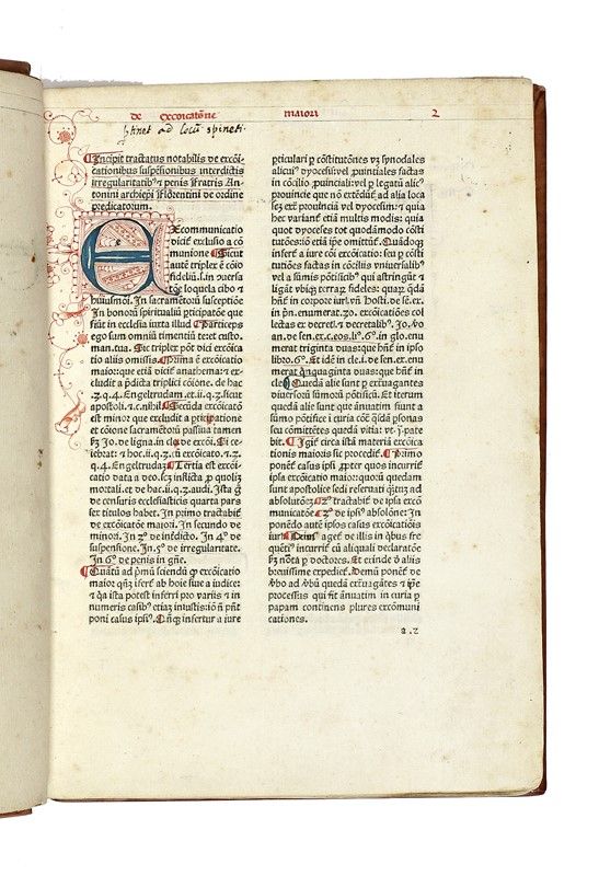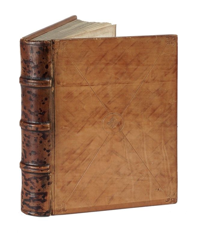In-4° (mm 246x163). Carte [136]. Segnatura: a-b10, c–k8, l6, m–q8, r6. Testo in carattere gotico, su doppia colonna, su 40 righe. Iniziali rubricate in rosso e blu o in rosso e viola, con decorazioni; titoli e foliazione in rosso; sottolineature in rosso ai titoli dei capitoli. Lievi fioriture sparse e mancanze reintegrate, senza perdite, alle carte r5-r6. Legatura successiva in piena pelle, montata su assi di legno, con impressioni a secco ai piatti e dorso a 3 nervi. Minime abrasioni.