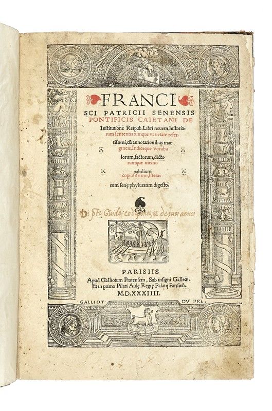 In folio (mm 310x210). Carte [14], CXXXI [i.e. CXXXIII]. 1 bianca. Frontespizio entro cornice xilografica, impresso a due colori, capilettera xilografici nel testo. Copia marginalmente gorata (gore più visibili in principio di volume) con numerosi errori di numerazione, ma completa. Legatura successiva in mezza pergamena con piatti in carta marmorizzata e titoli manoscritti al dorso. Tagli marmorizzati. Nota di possesso manoscritta al frontespizio.