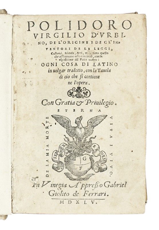 In-8° (mm 137x95). Carte [8], 257, [1], 1 bianca. Marca xilografica al frontespizio. Copia parzialmente gorata, con note manoscritte non più leggibili su alcune carte. Assente l'ultima bianca. Legatura in piena pergamena rigida con titolo in oro su tassello al dorso. SI AGGIUNGE: Id., De rerum inventoribus libri octo. Basileae: s.e., 1555. In-8° (mm 161x100). Copia con difetti.