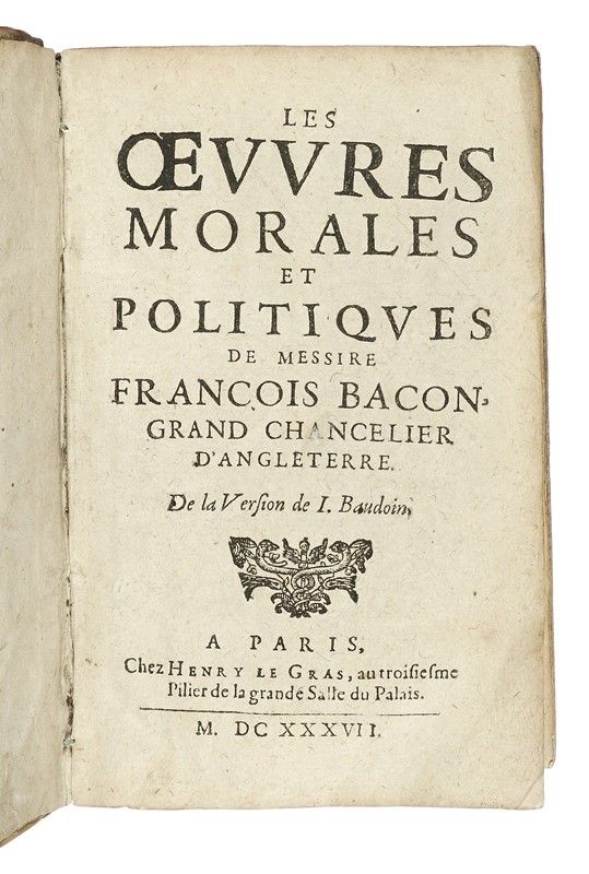 In-16° (mm 100x60). [28], 340, [32]. Frontespizio calcografico figurato. Alcune macchioline al frontespizio, lieve e uniforme brunitura della carta. Legatura coeva in piena pergamena con titolo manoscritto al dorso. SI AGGIUNGONO: Id., Les oeuvres morales et politiques [...] De la version de I.Baudouin. A Paris: chez Henri Le Gras, 1637. 1 volume in-8° (mm 167x110). Id., De Verulamio Historia regni Henrici septimi Angliae regis opus vere politicum. Lugd. Batavor.: apud Franc. Hackium, 1647. 1 volume in-12° (mm 128x65).