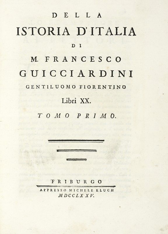 4 volumi in-4° (mm 270x193). Con 1 ritratto calcografico dell'Autore in antiporta, testatine, capilettera e finalini in legno. Restaurato l'occhietto del secondo volume. Sporadiche fioriture e macchioline, nel complesso buona copia. Legatura rimontata in mezza pelle con punte e piatti in carta marmorizzata, titoli in oro su tassello al dorso, fregi dorati sempre al dorso. Alcune mancanze nella carta dei piatti al primo volume, secondo rilegato con un diverso tipo di pelle e carta, ma identici fregi. Timbro di precedente collezione (ormai non più leggibile) all'occhietto di volumi 1,3 e 4, insieme a ex-libris cartaceo applicato.