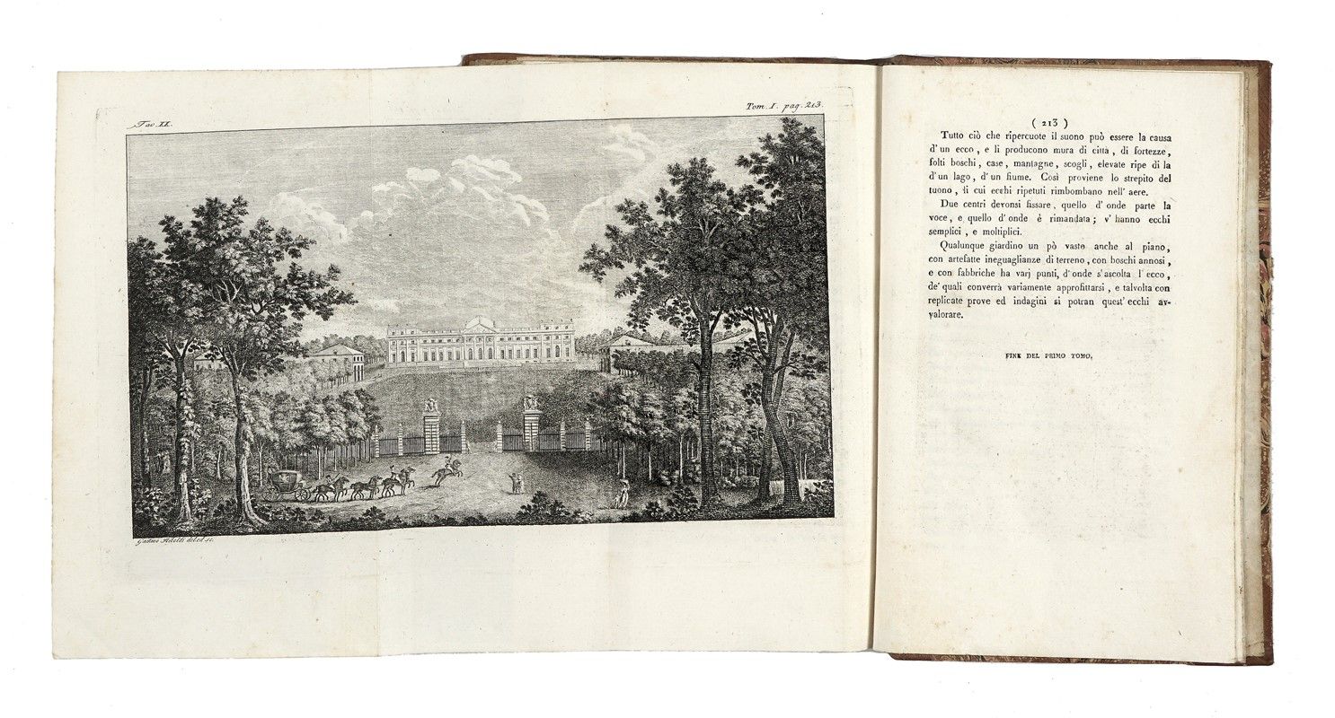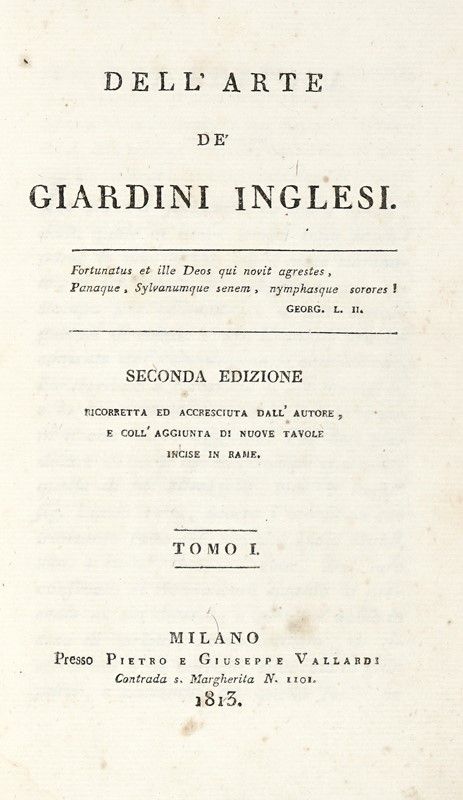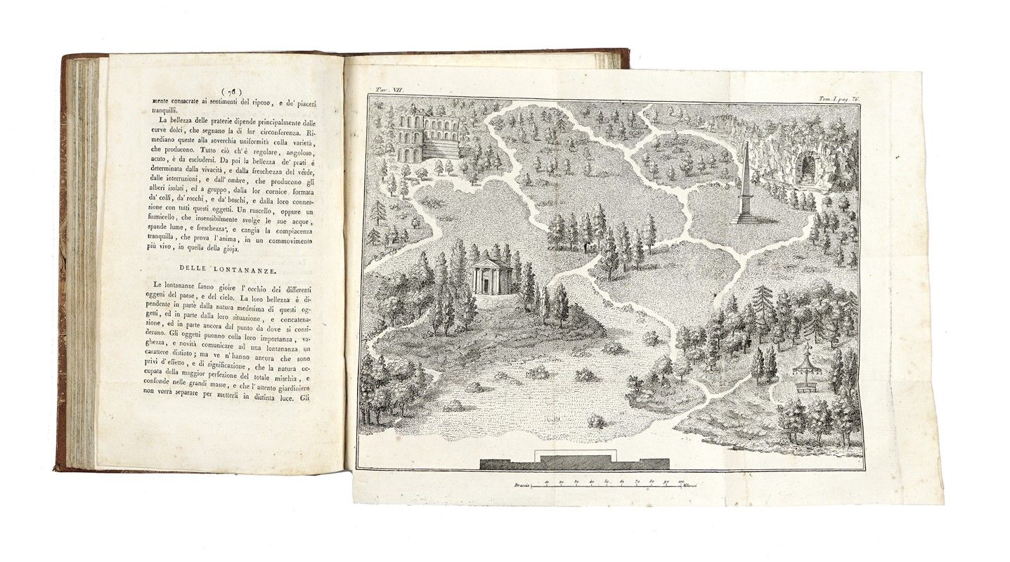 2 volumi in-8° (mm 205x128). Pagine [14], 218, [2], con 20 tavole calcografiche fuori testo, di cui 7 ripiegate; [4], 211, [1], con 20 tavole calcografiche fuori testo, disegnate a bulino e stampate da Gaetano Riboldi, alcune su disegno di Giuseppe Levati, di cui 5 ripiegate. Lievi e rare fioriture, e altre minime mende, altrimenti ottimo esemplare. Legatura coeva in mezza pelle, con punte e piatti in carta marmorizzata; titoli in oro su tassello al dorso e tagli spruzzati. Minime mende. SI AGGIUNGE: Il buon giardiniere che contiene dei nuovi principj di agricoltura; la descrizione, la storia ed il modo di coltivare tutte le piante da orto [...]. Con 45 tavole in rame [...]. Prima traduzione italiana [...]. Volume primo [-secondo]. Venezia: tip. Gaspari S. Felice, 1826. 2 volumi in-8° (mm 175x111). SI AGGIUNGE: Figure per il buon giardiniere rappresentanti in 45 tavole in rame [...] Opera che fa parte del buon giardiniere [...] Prima traduzione italiana... Venezia: tip. Gaspari S. Felice, 1826. In-8° (mm 180x105). SI AGGIUNGE: Re Filippo, Il giardiniere avviato nell'esercizio della sua professione [...] Volume primo (-secondo). Milano: per Giovanni Silvestri, 1844. 2 volumi in-8° (mm 165x100).