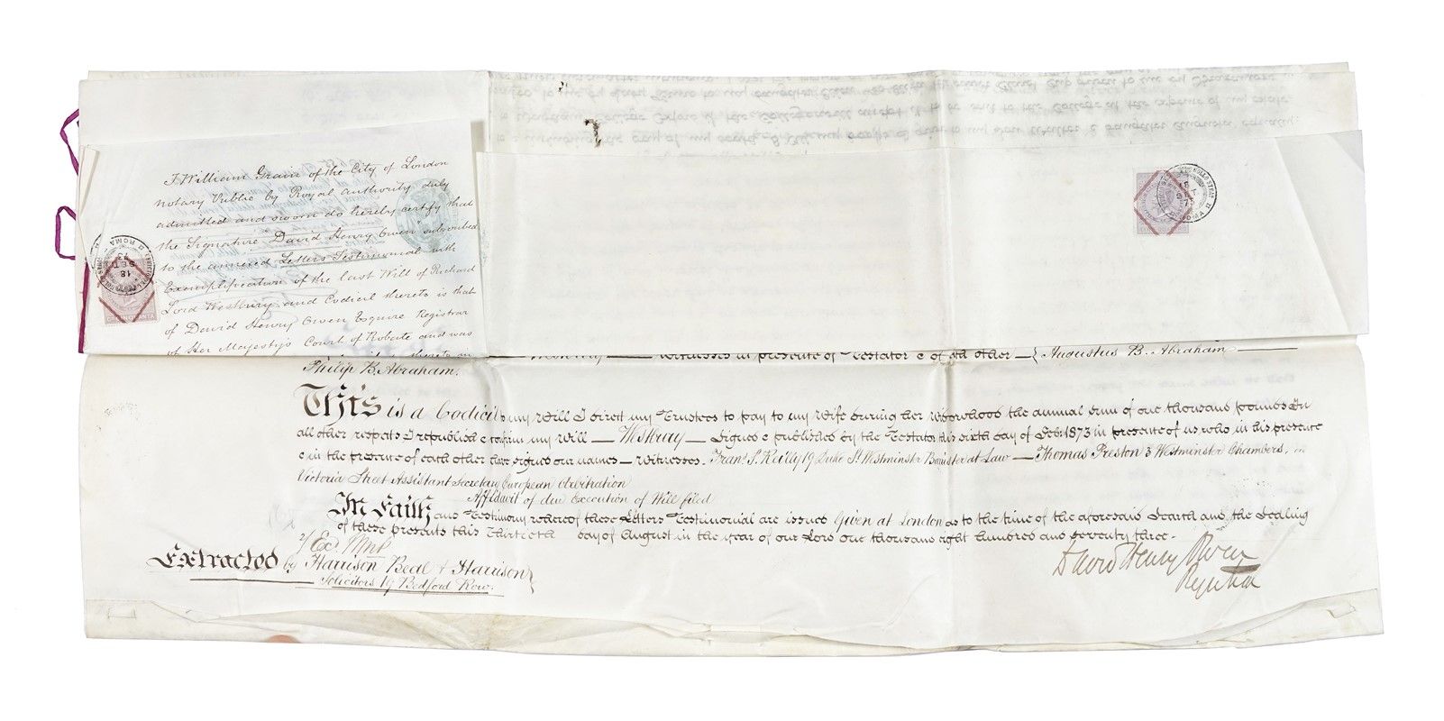 Manoscritto pergamenaceo a inchiostro nero, formato da tre pergamene legate tra loro. Testo in inglese. Conservati: un grande sigillo cartaceo, a secco e in rilievo, con lo stemma della regina Vittoria, un Embossed Tax Stamp (particolare bollo a secco blu, con piccolo inserto metallico lucido: ricevuta pagamento tasse), un sigillo notarile cartaceo rosso con laccetti in seta, vari bolli e annulli inglesi e italiani (Roma). Perfette condizioni. Dimensioni: 630x500 mm.