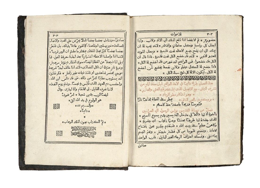 In-4° (mm 223x165). Carte [208]. Testo inquadrato, impresso in arabo, in alcune carte a due colori. Alcune bruniture, nel complesso buono stato. Legatura coeva in pieno marocchino nero impresso a secco ai piatti, titolo manoscritto in arabo su tassello cartaceo al dorso. Piatti con segni d'usura, mancanze lungo le cerniere. Testo identificato da Alessandro Balistrieri sulla base di foto. Lotto non passibile di restituzione.