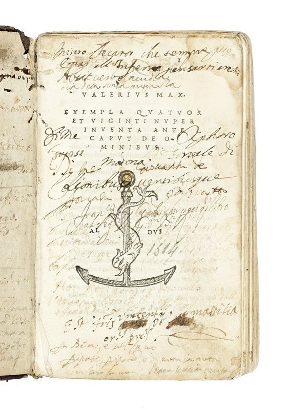 In-8° (mm 160x92). Carte 216. Marca aldina al frontespizio, ripetuta in fine. Prime e ultime carte marginalmente macchiate e gorate, un piccolo lavoro di tarlo nel margine interno del primo fascicolo, altri minori difetti conservativi. Legatura coeva in piena pelle con impressioni a secco ai piatti. Assente la cuffia superiore. Note manoscritte di mani diverse alla prima carta bianca, sul frontespizio e alle due carte successive. Altre note manoscritte in fine volume.