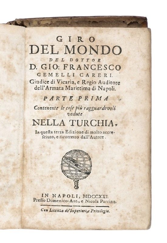 5 (di 6) volumi in-8° (mm 165x110). Pagine [24], 405, [11] con 1 antiporta incisa, 1 ritratto e 3 tavole fuori testo, di cui 1 ripiegata; 3) [8], 307, [13] con 12 tavole fuori testo, di cui 1 ripiegata; 4) [8], 456, [22], 2 bianche con 2 tavole ripiegate fuori testo; [8], 384 [i.e. 374], [30] con 2 tavole fuori testo; [8], 393, [15] con 2 tavole fuori testo. Con, nel complesso, 1 antiporta, 1 ritratto e 21 tavole. Primo volume con gore e una mancanza nella carta B2 dovuta a bruciatura. Corpo testo staccato dalla legatura. Terzo e quarto volume in variante B, con editore Felice Mosca. Quarto volume con parte la parte superiore della carta M5 mancante. Volumi diffusamente fioriti, con macchie marginali. Assente il volume n. 2 sulla Persia. Legatura coeva in piena pergamena con titoli manoscritti al dorso. Assente la cuffia superiore del volume 4, legature macchiate.