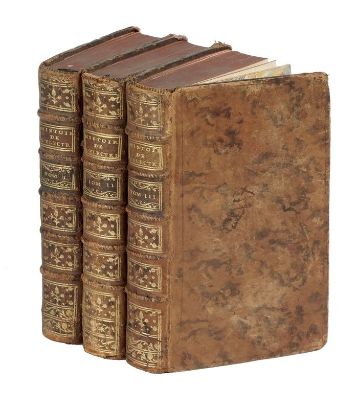 3 volumi in-12° (mm 165x92). Pagine XLVI, [2], 432, 2 bianche; [4], 531, [1] con 1 tavola ripiegata fuori testo; [4], 474, [6] con 8 tavole ripiegate fuori testo. Copia uniformemente brunita, con alcune bruniture più accentuate in fascicoli sparsi. Legatura coeva in piena pelle con titoli e decorazioni in oro ai comparti del dorso, tagli rossi, sguardie in carta marmorizzata. Tracce d'uso lungo le cerniere. Nota manoscritta in principio del primo volume.