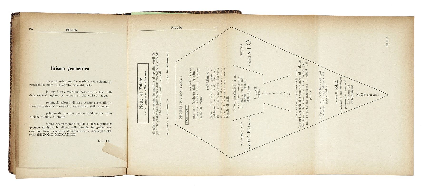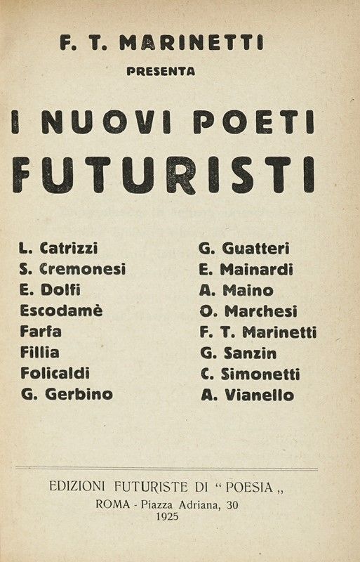 In-8° (mm 192x140). Pagine 361, [1] bianca. Con alcune tavole parolibere ripiegate nel testo. Usuali bruniture marginali della carta e strappetti marginali, restaurabili, ad alcune tavole. Legatura successiva in pieno cartonato, con titoli si tassello al dorso. Quest'ultimo staccato e in gran parte mancante. Copia probabilmente appartenuta a Tito Zaniboni, socialista noto per aver organizzato un attentato contro Benito Mussolini il 4 novembre 1925, come si evince dalla nota di possesso manoscritta al verso della prima carta bianca (Zaniboni. Napoli, ottobre 1925). SI AGGIUNGE: Pattarozzi Gaetano, Carlinga di aeropoeti futuristi di guerra collaudata da F.T. Marinetti. Roma: Edizioni di Mediterraneo Futurista, s.d. [i.e. 1941]. In-8° (mm 215x155). Brossura editoriale con titoli in rosso e nero al piatto. Minime macchie, ma nel complesso ottima conservazione, anche interna.