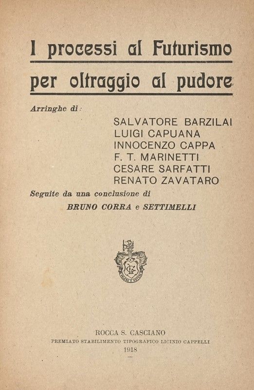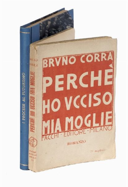 In-8° (mm 210x140). Pagine 147, [1]. Esemplare uniformemente brunito, con rare fioriture sparse e uno strappetto al margine interno dell'ultima carta, altrimenti ottima conservazione. Legatura successiva in mezza tela con punte, piatti marmorizzati e titoli in oro al dorso. Nota di possesso al recto della prima carta bianca. SI AGGIUNGE: Corra Bruno [pseud. di Ginanni Corradini Bruno], Perché ho ucciso mia moglie. Romanzo. 3° migliaio. Milano: Facchi, 1918. In-8° (mm 193x122). Esemplare in barbe, ben conservato. Brossura editoriale con titoli impressi al piatto anteriore. Qualche lieve mancanza alle cuffie.