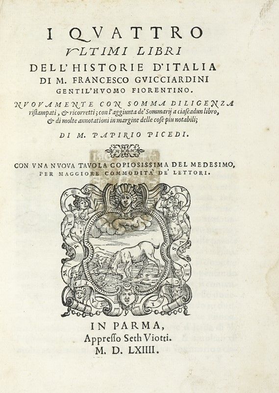 »In-4° (mm 205x154). Pagine [20], 216. Grande marca xilografica al frontespizio. Copia marginalmente fiorita, per il resto ottimo stato conservativo. Legatura settecentesca in piena pergamena rigida con titolo in oro su falso tassello al dorso, tagli blu. Ex-libris di precedente proprietario stampigliato al verso del frontespizio.