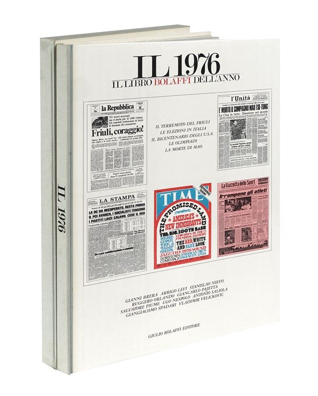 In-folio (mm 480x340). Con 3 litografie, 1 serigrafia e 1 incisione originale a piena pagina di Salvatore Fiume (Il Terremoto del Friuli), Ugo Nespolo (La Morte di Mao), Antonio Saliola (Buffalo Bill's original Wild West - Il bicentenario degli USA), Giangiacomo Spadari (Le elezioni in Italia) e Vladimir Velickovic (Le Olimpiadi), ciascuna numerata e firmata a matita dagli Artisti, con il timbro a secco Giulio Bolaffi. Ottimo stato di conservazione. Legatura editoriale in mezza tela, con piatti illustrati; entro cofanetto editoriale coordinato. Tiratura in 250 esemplari numerati.