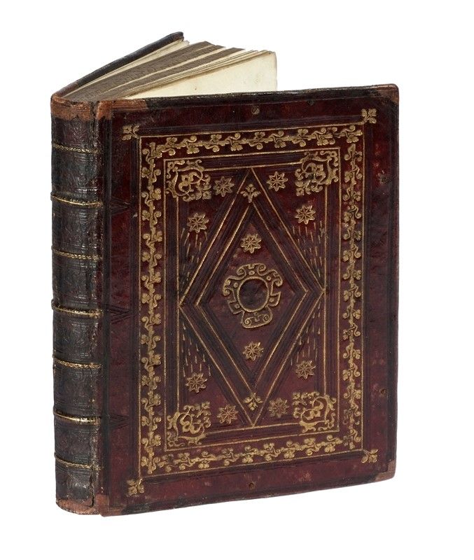 In-4° (mm 212x151). Carte [8], 197, [7]. Frontespizio xilografico, legni nel testo. Copia leggermente corta di margini, sporadici fascicoli bruniti in fine volume, un piccolo lavoro di tarlo nel margine interno delle carte da 37 a 54, per il resto ottimo stato conservativo. Legatura moderna con piatti antichi rimontati: piena pelle con cornici concentriche impresse in oro a ciascun piatto. Tagli oro. Sguardie rinnovate.