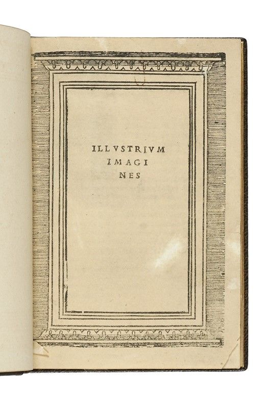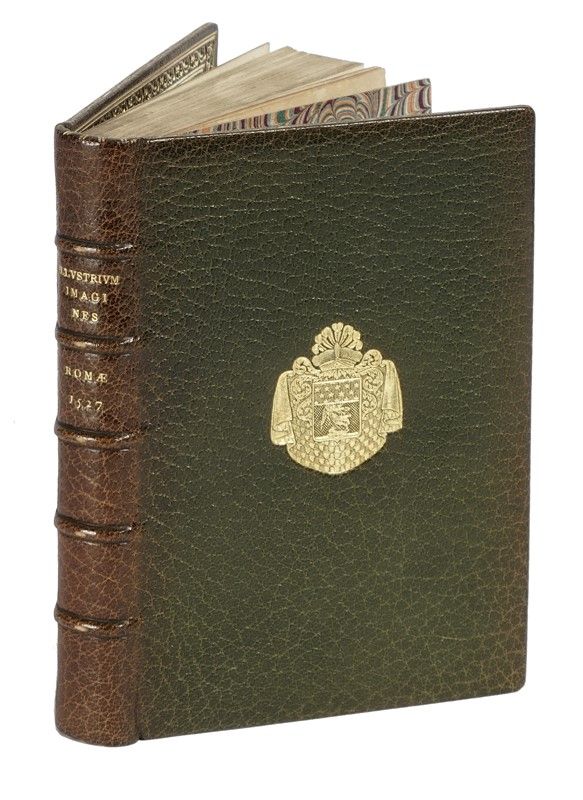 In-8° (mm150x100). Carte [4], IX-CXX. Frontespizio entro bordura xilografica, marca dello stampatore al colophon e numerosi ritratti entro medaglioni a sfondo nero inseriti in elaborate cornici architettoniche con al centro breve biografia. Fascicolo 2B assente e supplito in facsimile, restauri e bruniture nel primo fascicolo (strappata marginalmente la prima carta). Copia ricomposta, rifilata nei margini. Legatura ottocentesca in pieno marocchino verde con stemmi impressi in oro al centro di ciascun piatto e titolo dorato al dorso. Tagli oro, dentelles dorate, sguardie in carta marmorizzata. Legatura firmata M. Lortic. Brunitura dovuta a esposizione in corrispondenza del dorso.