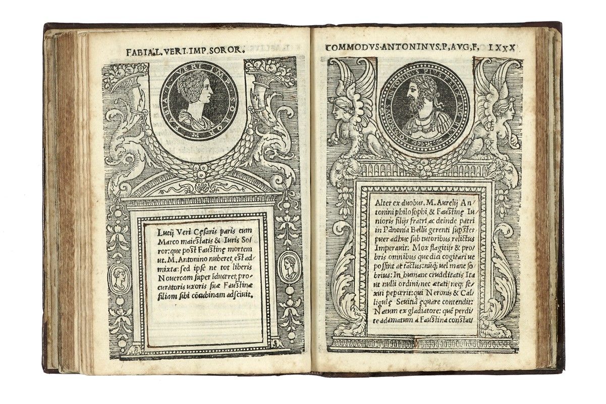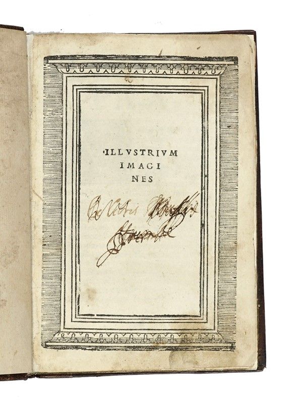 In-8° (mm 153x105). Carte CXX. Frontespizio entro bordura xilografica, marca dello stampatore al colophon e 202 ritratti entro medaglioni a sfondo nero inseriti in elaborate cornici architettoniche con al centro breve biografia. Esemplare leggermente rifilato, con parte delle carte fiorite. Lievi gore marginali a rari fascicoli. Legatura successiva in piena pelle con piatti provenienti dalla legatura originale (piatti parlanti, con titolo, stemma, cornici impressi in oro e a secco a entrambi i piatti. Tagli oro. Nota di possesso cassata sul frontespizio, note manoscritte in greco nel testo.