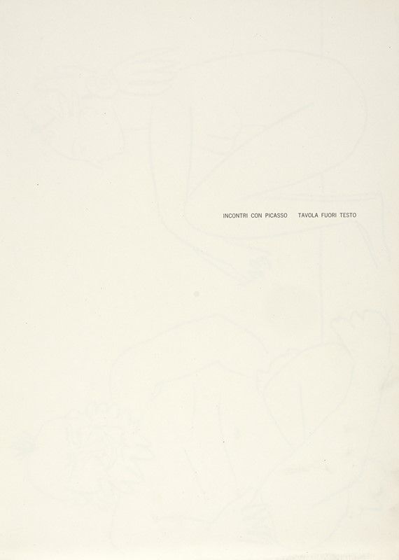 In-folio (mm 490x375). Esemplare in ottime condizioni, con numerose riproduzioni a colori di opere di Pablo Picasso a piena pagina, protette da velina. Presente, sciolta, la tavola litografica a colori dell'Artista, con piccole pieghe marginali. Legatura originale in piena tela rossa con titoli al dorso e riproduzione della firma dell'Artista in oro al piatto. Entro custodia originale in mezza tela coordinata. Difetti e mancanze; tracce di polvere ai piatti e difetti da esposizione al dorso. Uno dei 700 esemplari a numerazione romana, con una composizione litografica a colori fuori testo, su una tiratura complessiva di 2600 copie.