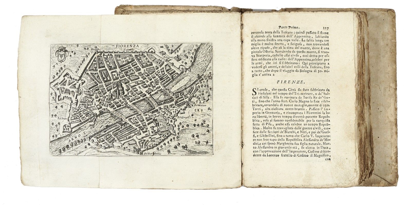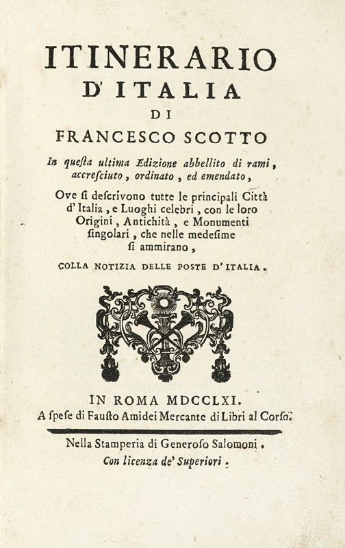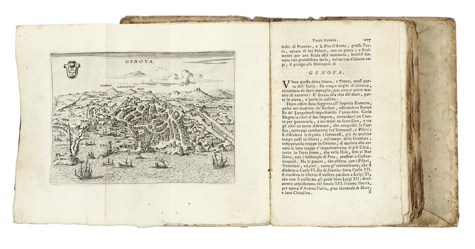 In-8° (mm 190x126). Pagine 2 bianche, XII, 419, [1] + 1 antiporta e 26 tavole calcografiche fuori testo, ripiegate. Fregio xilografico al frontespizio. Esemplare in barbe, con lievi fioriture, rare gore marginali e forellini di tarlo alle ultime pagine; internamente allentato, con la carta E8 slegata, ma presente, e con l'ultimo fascicolo quasi completamente staccato. Un ampio strappo restaurabile alla carta di Urbino. Legatura in pieno cartonato coevo, con titoli manoscritti al dorso. Difetti e mancanze al dorso e alle cerniere. Annotazione manoscritta alla prima carta bianca.