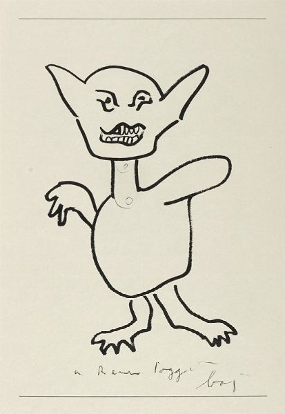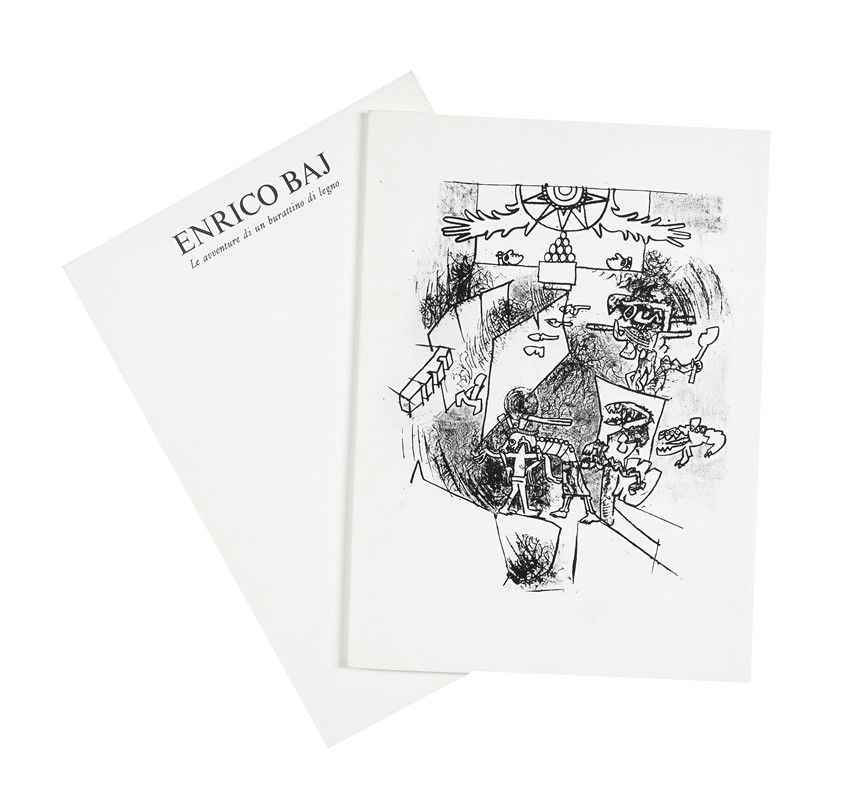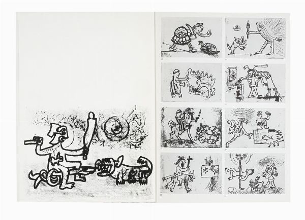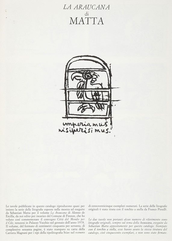 1 cartella editoriale in-4° (mm 340x245). Esemplare a bifoli sciolti, con due litografie originali a piena pagina, eseguite da Sebastian Matta per questo catalogo. Ottimo stato di conservazione. SI AGGIUNGE: Baj Enrico, Le avventure di un burattino di legno. [Firenze]: Casa Usher, [1980]. 3 fascicoli sciolti in 1 cartella editoriale in-4° (mm 345x250). Carte [14], con numerose illustrazioni, anche a piena pagina a colori, di Enrico Baj. Dedica autografa manoscritta dell'Artista a una delle tavole.