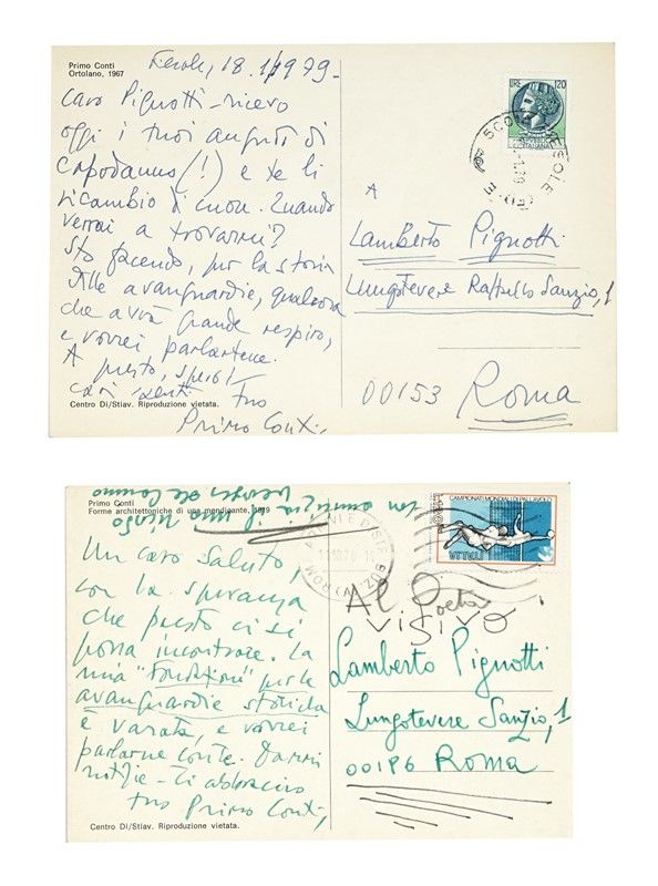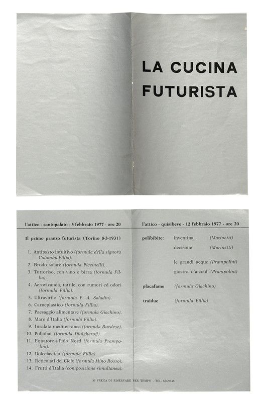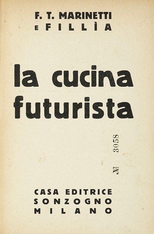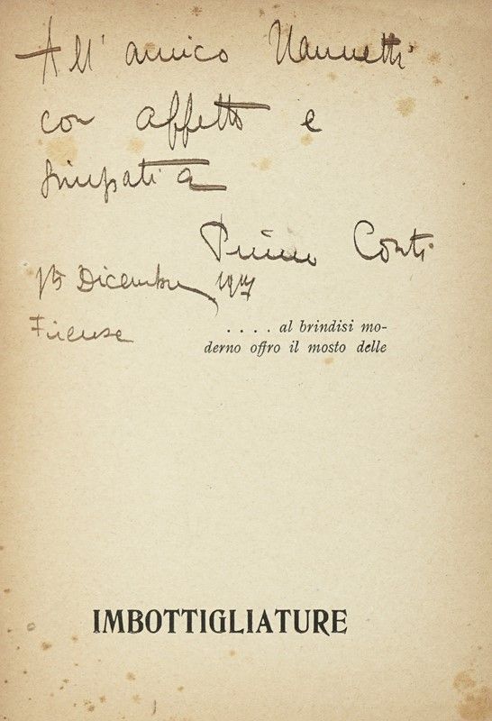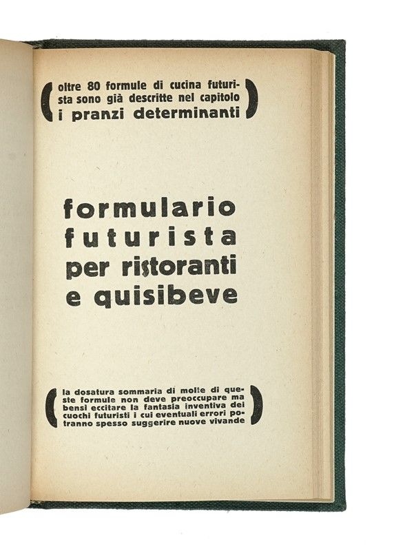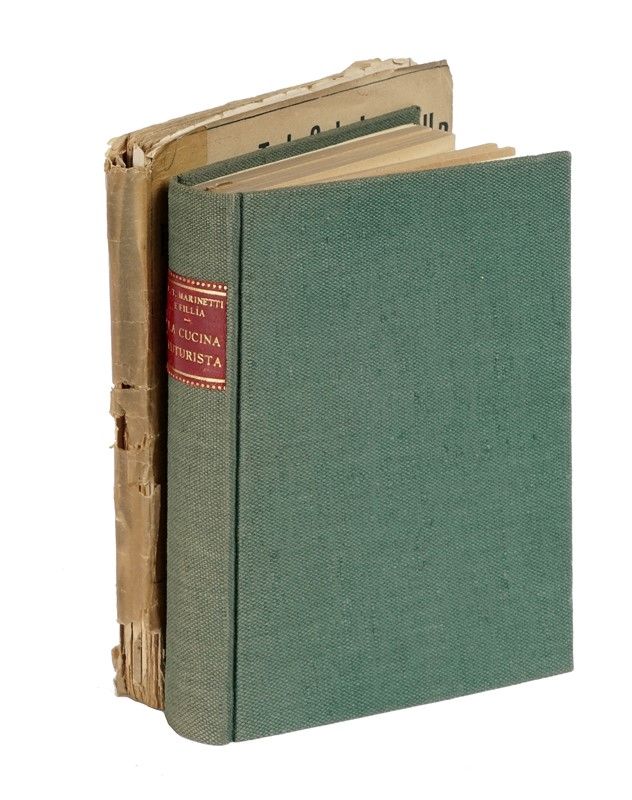 In-16° (mm 175x113). Pagine 267, [5]. Con 3 tavole in bianco e nero fuori testo e alcune illustrazioni di Prampolini nel testo. Rinforzo al margine interno dell'occhietto e tracce di matita nel testo, altrimenti buona copia. Legatura moderna in piena tela, con titoli in oro su tassello al dorso. Contenuto all'interno il menù della Taverna del Santopalato di Torino di una cena futurista organizzata il 5 febbraio 1977. Numerazione a timbro al frontespizio. SI AGGIUNGE: Conti Primo, Imbottigliature sono misure e straripamenti intellettuali. Firenze: Edizioni de L'Italia Futurista, [1917]. In-8° (mm 195x135). Brossura originale con strappetti marginali e dorso assente ma sostituito con velina, parzialmente mancante; piatto anteriore internamente staccato, esemplare allentato, con difetti. Marginalmente rifilata, con mancanze al titolo, l'amplissima unghiatura di copertina. Dedica autografa manoscritta dell'Autore all'amico Nannetti, con affetto e simpatia, datata 15 Dicembre 1917. SI AGGIUNGONO: Due cartoline autografe firmate di Primo Conti a Lamberto Pignotti, una delle quali datata 1979.