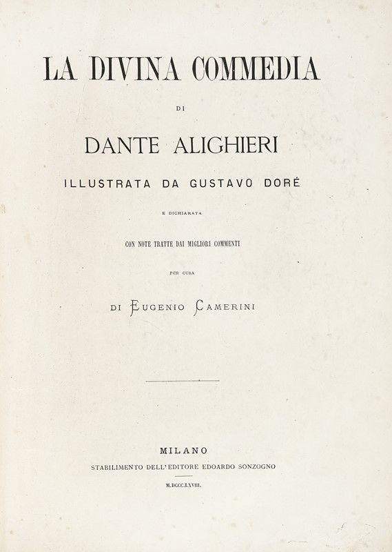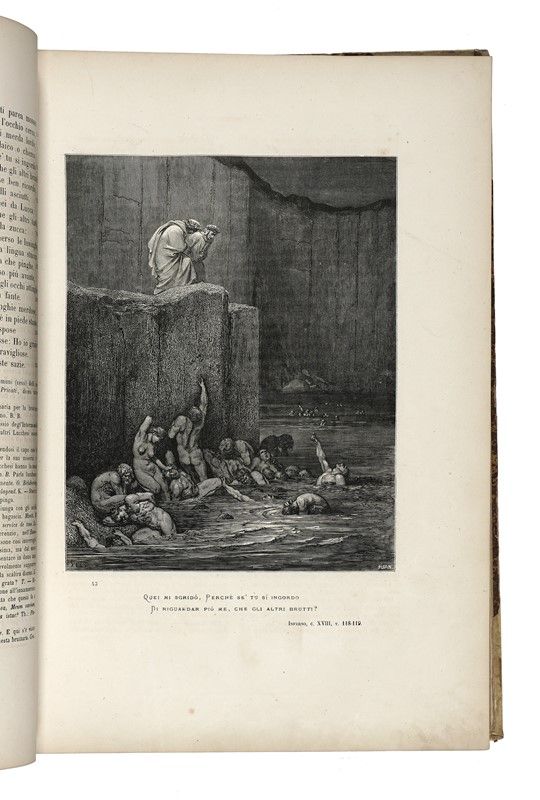 3 parti in 1 volume in-folio (mm 413x294). Pagine [2], X, 136, [2]; VIII, [2], 134; [8], 132, [4]. Ciascuna parte con proprio frontespizio; ritratto dell'Autore illustrato dal Dorè e, complessivamente, 135 tavole calcografiche fuori testo. Strappetti marginali senza perdite, con tracce di nastro adesivo alle pagine IX-X della prima parte e un ampio strappo restaurabile alle pagine 13-14 della seconda. Esemplare fiorito, con lievi, diffuse, bruniture. Legatura coeva in mezza pergamena, con punte e piatti in carta marmorizzata; titolo in oro su tassello al dorso e tagli spruzzati di rosso. Ex-libris applicato al contropiatto anteriore. Tracce d'usura ai piatti, altrimenti buono stato complessivo.