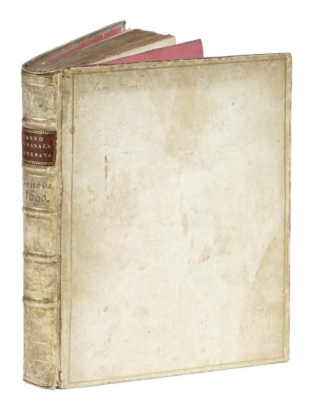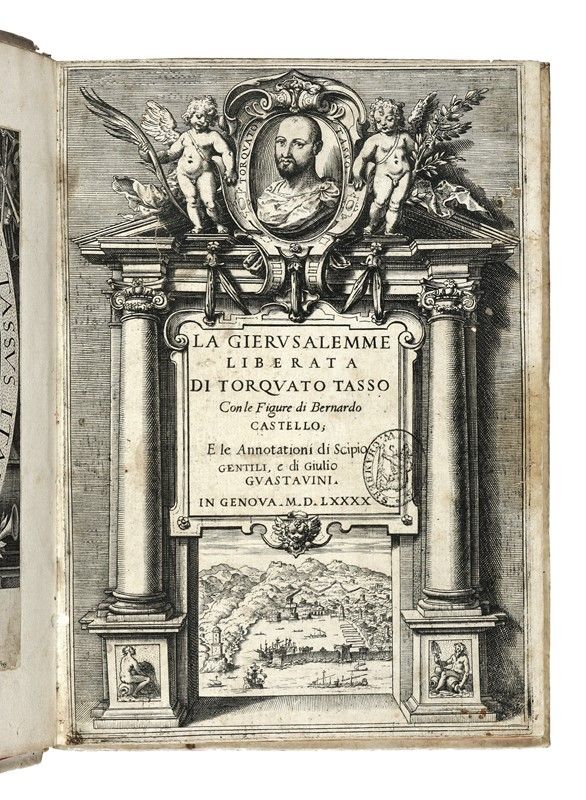 In-4° (mm 240x170). Pagine 11, [1], 255, 1 bianca, 40, 71, [1], [8]. Frontespizio architettonico calcografico con il ritratto dell'Autore e 20 splendide tavole a piena pagina, incise a bulino da Agostino Carracci e da Giacomo Franco. Con, in aggiunta, un ritratto dell'Autore proveniente da altra edizione rilegato prima del frontespizio (incisione riquadrata al margine della battuta e riapplicata su carta). Testatine, capilettera e finalini in legno. Tavole a piena pagina incise Giacomo Franco e Agostino Carracci. Frontespizio controfondato, copia corta di margini, lievi ma diffuse bruniture nel testo. Legatura in piena pergamena rigida con titoli e decorazioni impressi in oro al dorso, cornice di singolo filetto dorata a ciascun piatto, tagli e sguardie rossi. Dati editoriali appuntati a mano sul dorso. Timbro di precedente collezione sul frontespizio. Note manoscritte in principio di volume.