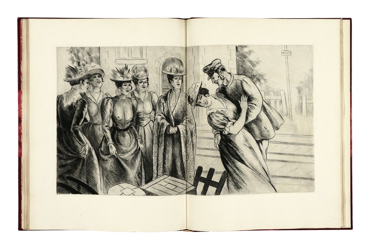 In-4° (mm 325x245). Carte [40]. Opera interamente incisa in calcografia (bulino e puntasecca) con testo impresso in rosso e nero. Molte illustrazioni a mezza, piena e doppia pagina. Copia in ottimo stato. Esemplare n. 100, uno dei 65 esemplari su velin numerati da 32 a 106. Legatura coeva in mezzo marocchino rosso, con punte e piatti in carta decorata, titolo in oro su tassello al dorso, tagli in carta decorata. Alla prima carta bianca piccolo disegno di Léon Courbouleix siglato a matita L.C., corredato da dedica firmata dell'autore.