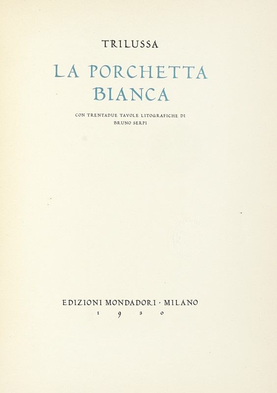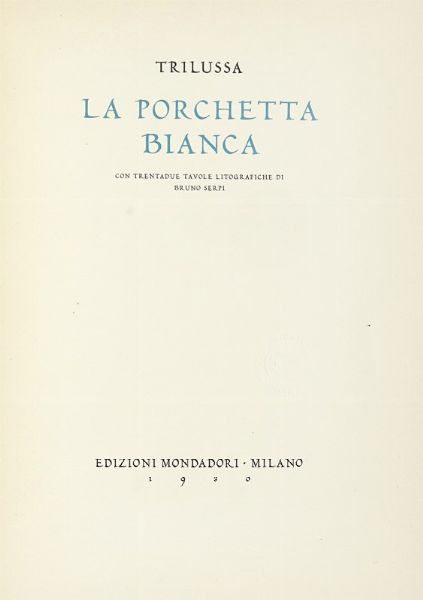 In-4° (mm 350x245). Pagine [2] bianche, 69, [3]. Con testo in nero e azzurro e 33 tavole litografiche a colori applicate a piena pagina nel testo di Bruno Serpi. Legatura editoriale in piena tela, con titoli in oro al piatto anteriore e al dorso. Tracce di usura; mancante la sovraccoperta originale. Tiratura in 1000 esemplari numerati.