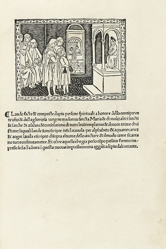 In-4° (mm 234x160). Carte [117] di [118]. Segnatura: π4 (-π1) a-n8 o10. Testo in carattere tondo su due colonne (R 97). Iniziali xilografiche. Assente la carta π1, supplita in facsimile. Restauri marginali a parte delle carte, più evidenti a carta h2 (angolo inferiore esterno ricostruito) e alle carte da o6 a o10. Ultima carta con ampie mancanze, controfondata. Alcune fioriture e macchioline nel testo. Legatura moderna in mezza pelle con piatti in percallina, titoli e decorazioni in oro ai comparti del dorso. Rilegata in principio carta manoscritta da mani diversi di commento alla copia.
