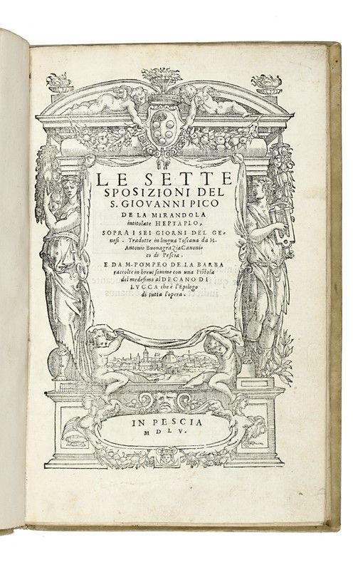In-4° (mm 222x140). Pagine 158, 2 bianche. Frontespizio entro cornice xilografica manieristica contenente lo stemma dei Medici e la veduta di Firenze; illustrazione xilografica al verso del frontespizio; capilettera in legno. Sporadiche macchioline, per il resto ottima copia. Legatura settecentesca in piena pergamena rigida con titoli impressi in oro su tassello al dorso. Sguardie in carta marmorizzata blu.
