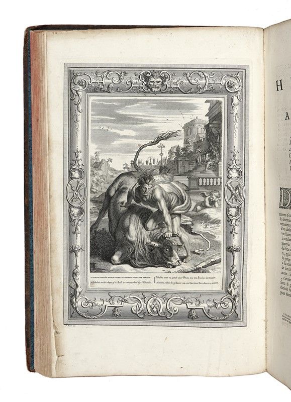 In folio (mm 455x295). [10], 152, [4] con 1 frontespizio inciso e 60 tavole a piena pagina fuori testo. Frontespizio calcografico impresso a due colori. Fascicolo O parzialmente staccato, con alcuni difetti marginali in corrispondenza dei tagli, strappi restaurati (che interessano il testo) alla carta V2, strappetto che interessa l'inciso alla tavola XLVI, altri minori difetti conservativi ma buona copia, completa. Legatura coeva in piena pelle con cornici impresse in oro ai piatti e titoli e decorazioni dorate ai comparti del dorso. Titolo su tassello. Tagli spruzzati in rosso, sguardie in carta marmorizzata blu. Mancanze in corrispondenza delle cuffie e dei nervi, unghiature lise.