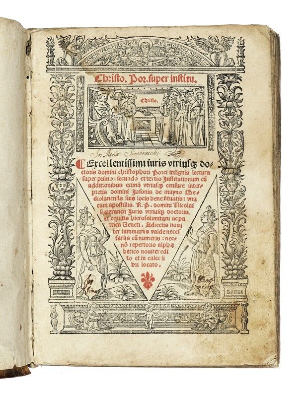In-4° (mm 200x145). Carte [9], 1 bianca, CCVIII. Frontespizio figurato impresso a due colori, marca tipografica in fine. Copia gorata (gora più visibile in principio e fine di volume), con una macchia nel margine inferiore delle ultime carte. Altri minori difetti conservativi. Legatura coeva in piena pergamena floscia con titolo manoscritto al dorso e al piatto anteriore. Sul piatto anche bozzetto a inchiostro nero di figura maschile. Sulla carta di sguardia posteriore (restaurata al verso) ulteriore nota e bozzetto manoscritto, raffigurante un ippogrifo, datata 1561.