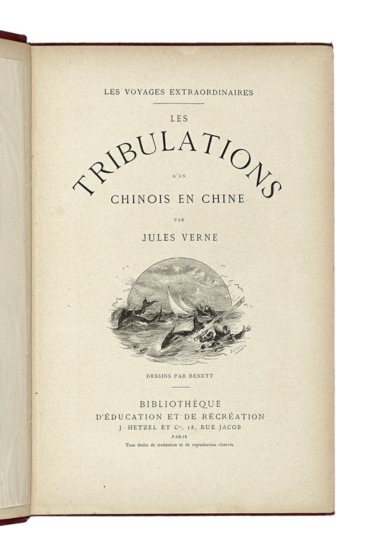 In-8° (mm 266x170). Con 1 antiporta fuori testo, protetta da velina, e numerose illustrazioni in bianco e nero nel testo. Legatura editoriale in percallina, con ampie impressioni a motivi fitomorfi e titoli in oro, entro cornici geometriche, al piatto anteriore e al dorso; decorazioni in nero a quello posteriore. Tracce d'uso alle cerniere, ma nel complesso buona copia. SI AGGIUNGE: Id., Le sphinx des glaces […]. 68 illustrations par George Roux... Paris: J. Hetzel, s.d. In-8° (mm 279x170). Legatura successiva in mezza tela con punte e piatti in carta marmorizzata; titoli su tassello in oro al dorso. SI AGGIUNGE: Id., Une ville flottante. Les forceurs de blocus. Aventures de 3 russes et de 3 anglais. Vignettes par Ferat... Paris: J. Hetzel, s.d. [i.e. 1872 ca.]. In-8° (mm 279x170). Legatura successiva in mezza tela con punte e piatti in carta marmorizzata; titoli in oro al dorso.